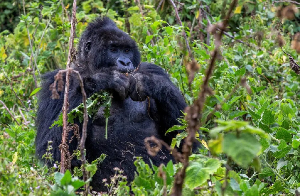 An endangered high mountain gorilla eats in the forest within the Volcanoes National Park near Kinigi, Musanze District, Rwanda, August 31, 2023. (credit: REUTERS)