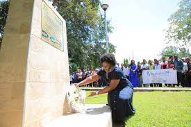 The Arumeru District Commissioner, Ms. Emmanuella K. Mtatifikolo lays a wreath at the Commemoration monument at the EAC gardens.